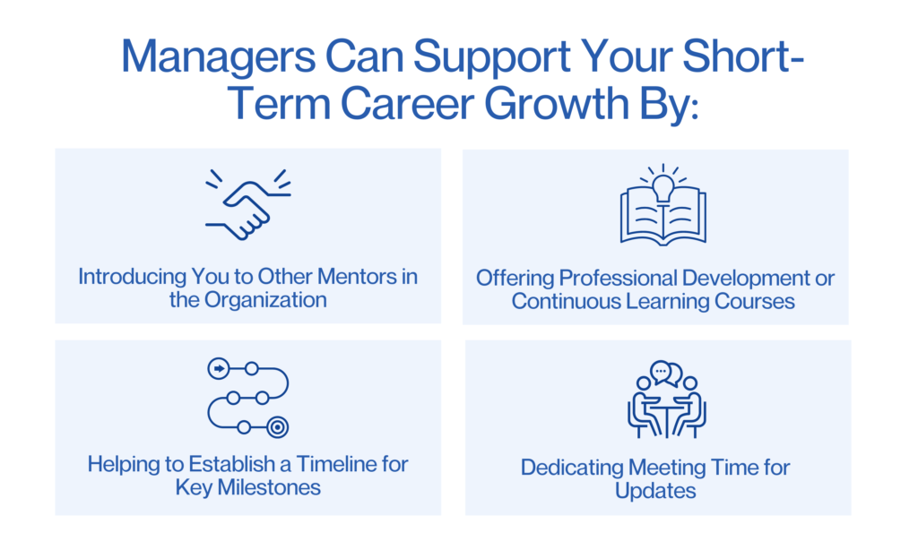 Consider ways your boss can support your development in the short term, such as offering you a stretch assignment, time to attend a workshop or conference, or professional development training. Quick wins can keep you motivated as you work to accomplish your career goals. Below are a few examples of how your manager can start supporting your career growth today.