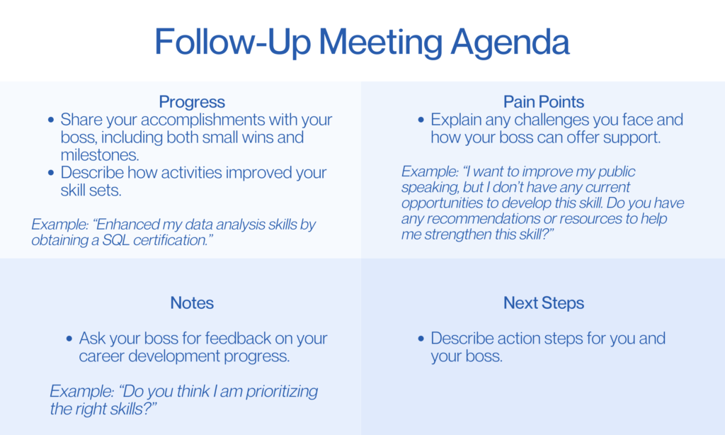 Below is an example of a check-in meeting agenda to help guide a follow-up discussion with your boss.