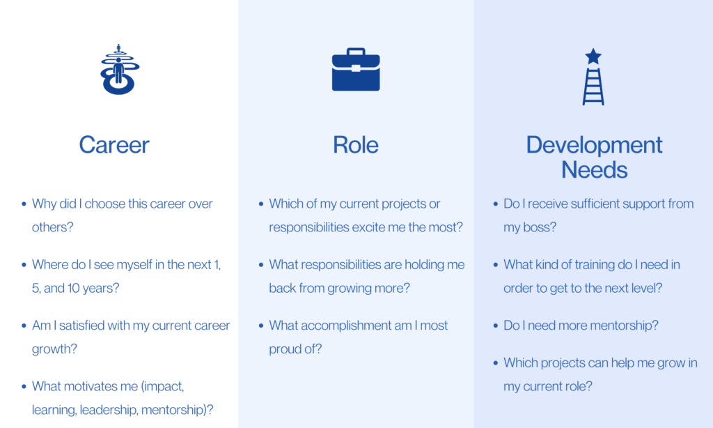 To create an effective growth plan with your manager, you need to be specific in your requests. This will likely require some introspection and outside research. Ask yourself questions about your career progress, role, and development needs using the example below. Check out the three Ps (Purpose, Passion, Potential) and three Ms (Match, Money, and Motivation) for additional career planning help.